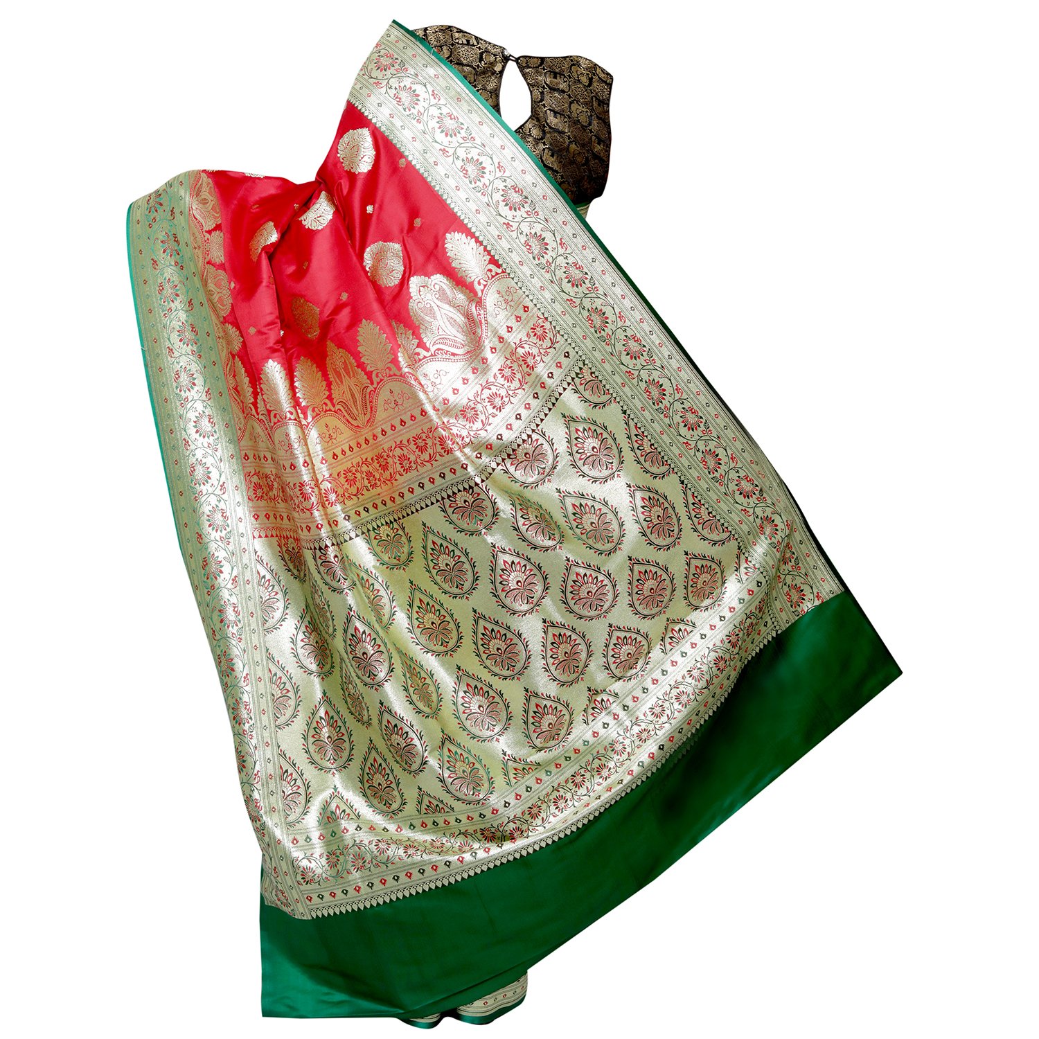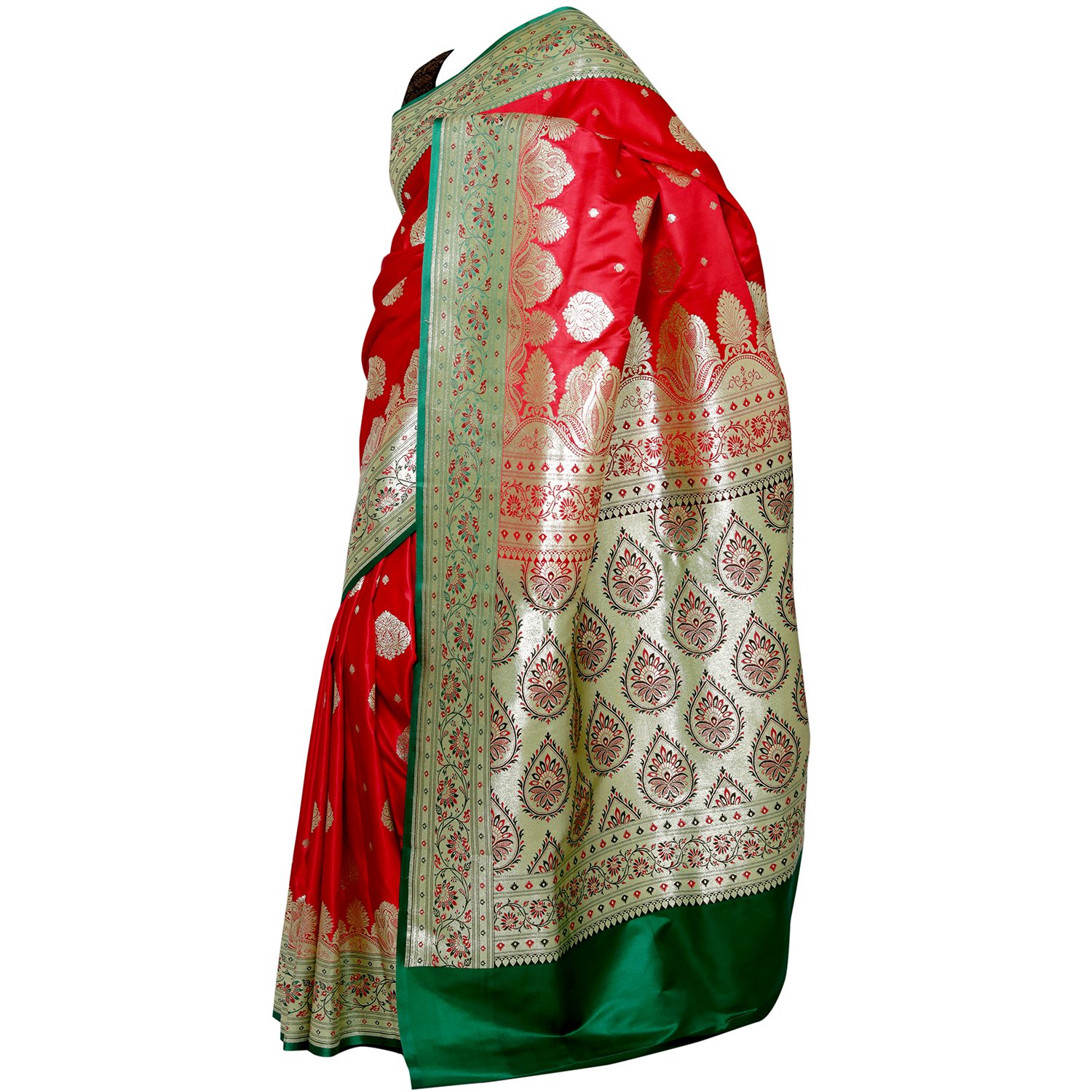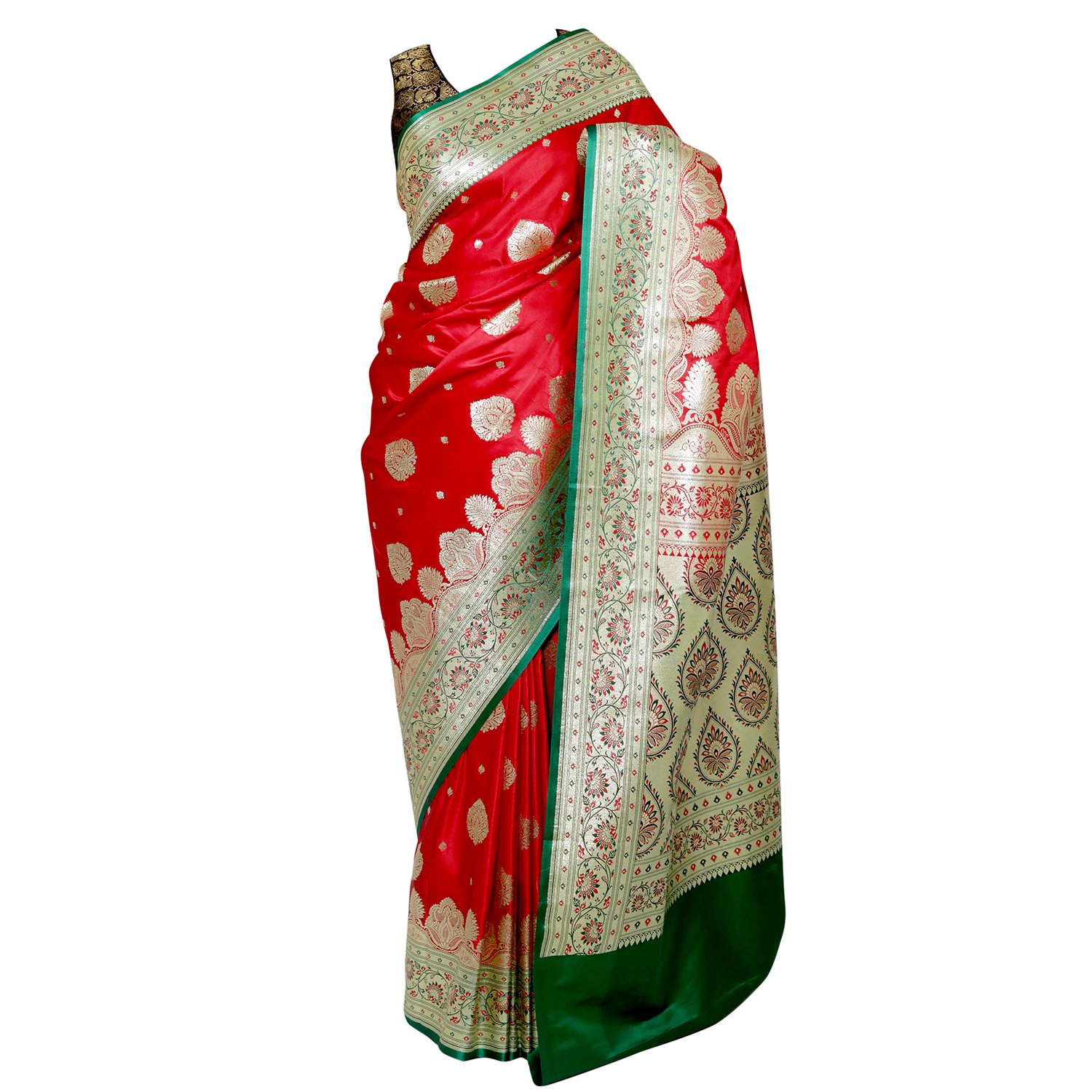 Buy Banarasi Saree: The attire is unstitch with Red and Dark Green Gold Zari color in casual wear.